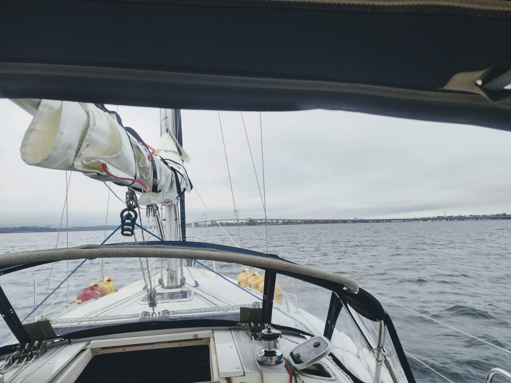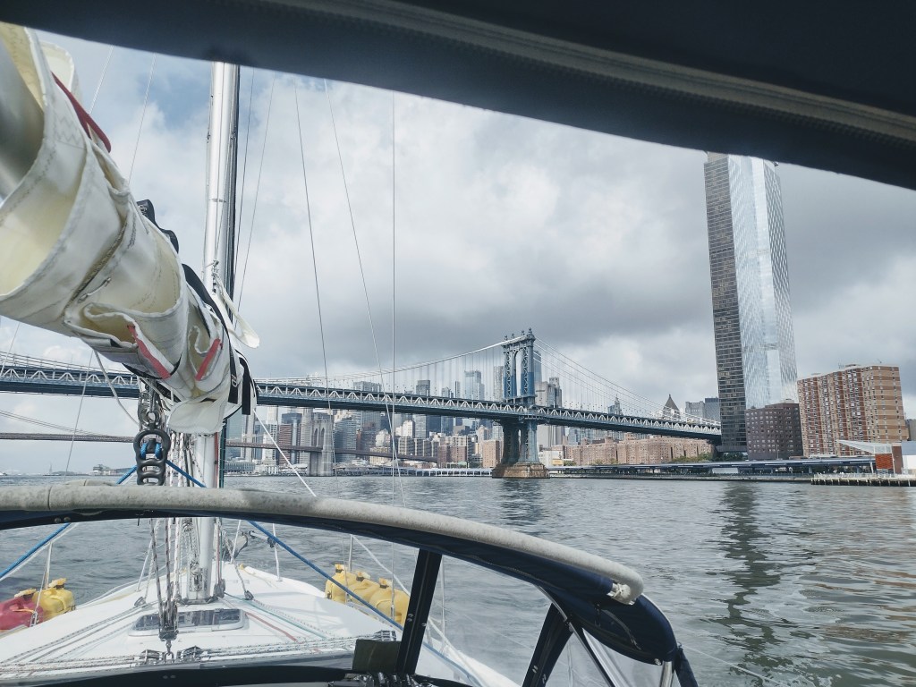We approached the Throgs Neck Bridge right on time. There was little to no traffic on the water so things were going great!! You could hear the noises of the city start to get louder the closer we got. Soon we had gone under the bridge and were in the East River. The currents were just starting to turn to ebb so our speed over ground started slowly increasing. For a sailboater, any time your speed over ground is more than your boat speed thru the water is a time for much rejoicing…😁.