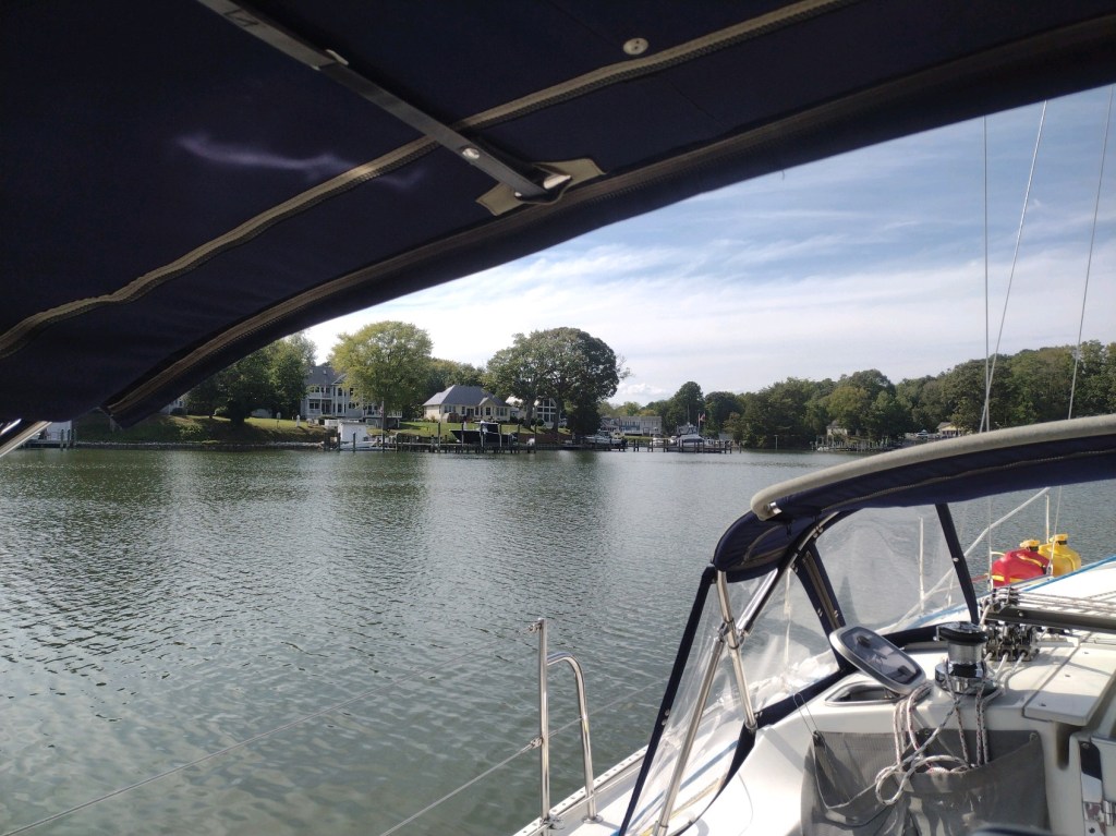 The next morning, we dinghied into town to go to the Calvert Marine Museum that is dedicated to the Solomon Island area of the Chesapeake Bay. We got there just as it opened and enjoyed a couple of hours looking at the exhibits. The otters were kinda shy though so I didn’t get a chance to see them. We then walked to the local shopping area to get supplies for the boats as we knew we’d be stuck on them for a few days. After getting everything we needed, we walked back to the dinghy and left to head back to the boats. About this time, the wind had started to pick up a bit so it was a sporty ride for the 2 or so mile ride back. We even tried to tuck in behind a sailboat that was making it’s way up the creek but they soon turned off into a slip along the shore.