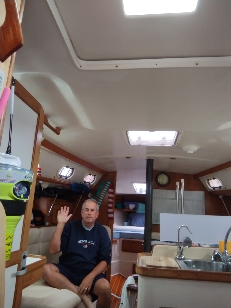 So as you can see in the picture, a Costco ship was making it’s way out of Norfolk as we were coming in. Big ship = Big wake. You can also see the hatches open on the deck of Infinity. See what’s coming? So the ship went by and we turned towards the ships wake to go thru it. The wake was a lot bigger than expected and at one point, one of the waves broke over the bow and all that water went down the front hatch and into the berth that I sleep in. 😖😖😖🤬🤬🤬. The mattress, the mattress topper, my pillow, and all of the floorboards to the back of the boat got soaked with lovely salt water. There was nothing I could do at that point so I ran up front, closed the hatches, and kept on motoring until we got to the anchorage for the night. I did spend the next few days drying things out, trying to get as much salt out as possible, and reprimanding myself over and over for being so dumb. We anchored that night at Hospital Point and a couple hundred yards away was milemarker 0.0 so I was officially on the ICW!!