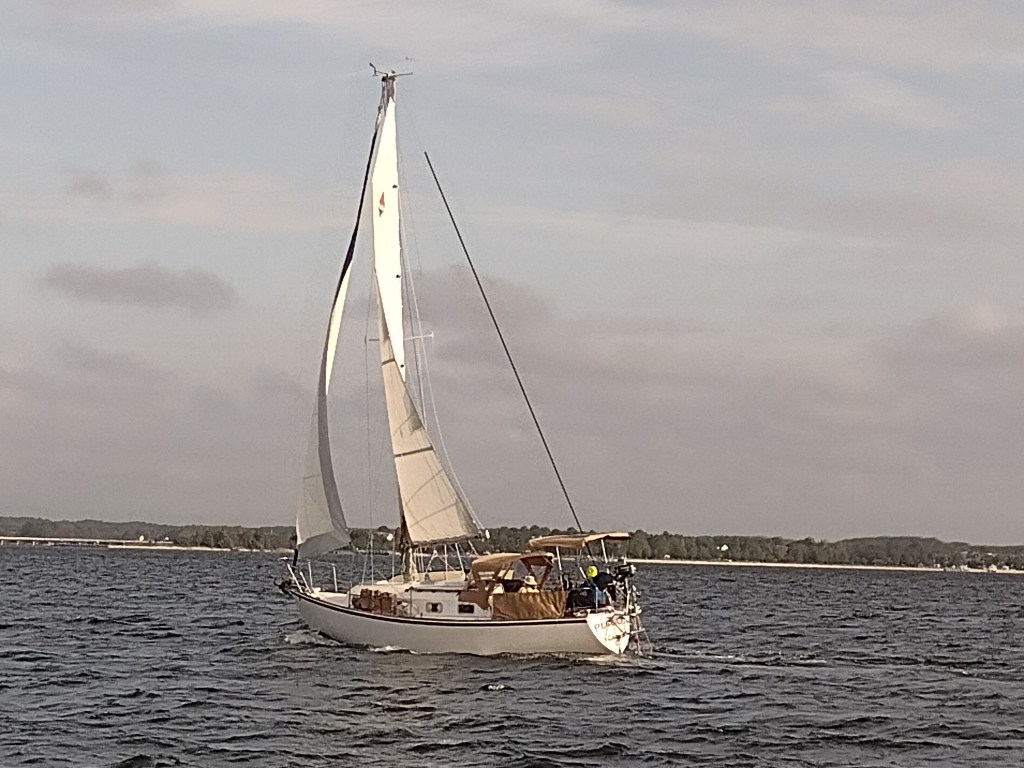 What a beautiful morning it was as we left Cambridge to continue heading south to the hidey-hole for the upcoming blow. There was enough breeze to get the headsail out and do some motorsailing back down the river to the Chesapeake. Now that there were two boats, we looked like a mamma duck with a baby duck in tow. I was glad the weather was going to be nice for my first day solo but that would all soon change very shortly.