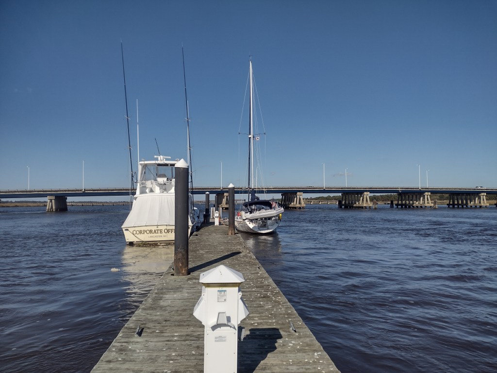 The day came to leave Georgetown and start heading back down the river to get back on the ICW. Leaving the dock turned out to be a lot more exciting for both boats as the currents were swift and trying to move us towards the bridge in the picture…yikes. I was a lot closer to the bridge than Pegu was but I had an engine that has more power and wasn’t trying to blow up. There were still a few tense moments after the dockhands have me a half-hearted push away from the dock and the current got me. That bridge got real big, real fast and there was no way I would fit under it. I think Infinity could sense that as she got her poop squared away real quick and we slowly started motoring down the river. The real heart attack came when those same dockhands did the same thing to Pegu Club even after Jeff had told them how he wanted things to go. I could hear the commotion all the way out to Infinity!! They, too, got things under control and off we went down the river.