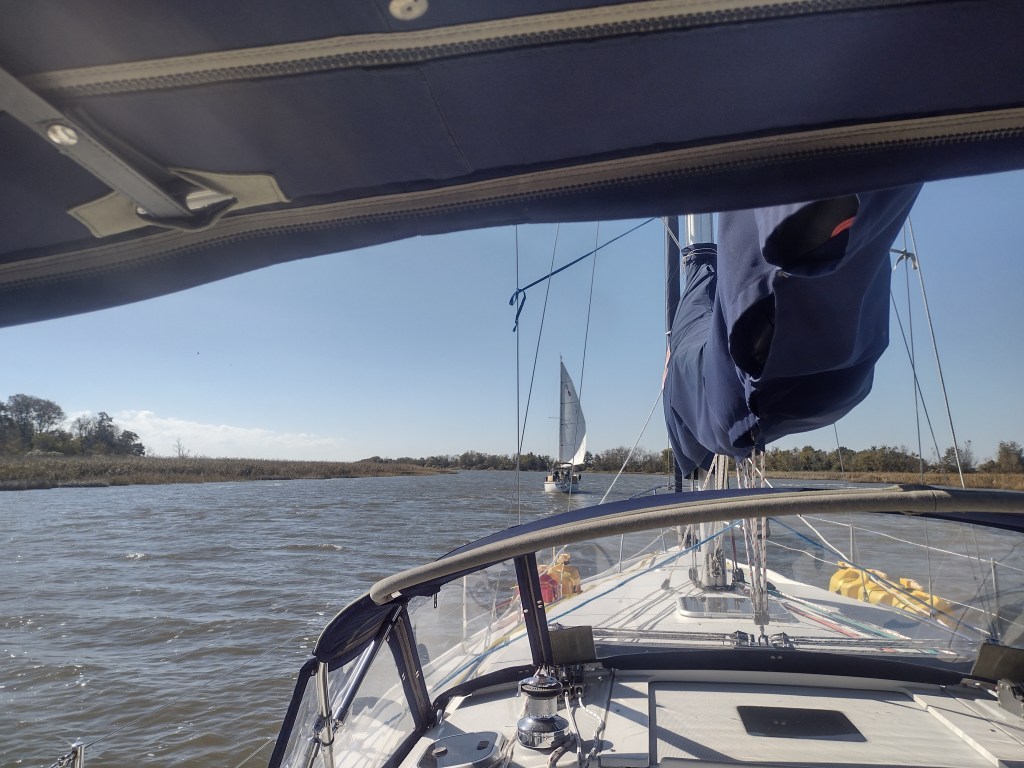 We entered the ICW right where the engine issue has started and kept going. Pegu was using the north winds behind her to sail south so things were looking good. I had Infinity about an 1/8th mile behind them just in case the winds dropped and we needed to tow their boat. The day ended up being successful as we made it to our planned anchorage to hold up for a couple of days to wait out some weather.