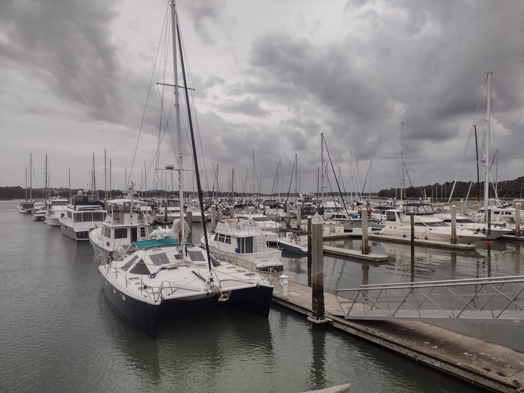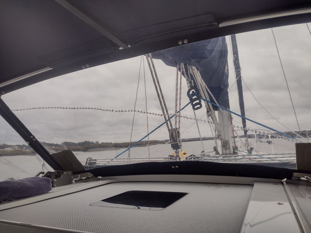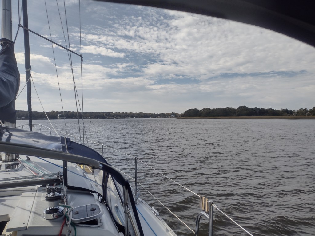 The Pegu crew started working on sourcing a new engine and a place to get the work done. They decided that the place they’d been working with in Charleston wasn’t the best choice so inquires to the cruising community brought to light a company in Savannah that was very responsive and was reasonably priced to get the work done. A new engine was ordered and a spot in a marina in Savannah was reserved so they could come in and swap out the engine. While this was going on, I was starting to figure out how I was going to find a place for Infinity so I could go home for the holidays (the original plan was to be in Vero Beach FL by now and the boats would be on a mooring there). I wanted to put her in a slip instead of a mooring so she’d be plugged into shore power. Everything came together pretty much in a couple of hours with me finding a marina on Hilton Head that was within my budget, I was able to change my train ticket so I’d be picked up in Savannah, and I even reserved an Uber ride to and from the train station. It was a productive morning for sure so I planned to weigh anchor a few days later and make the short trip down to Hilton Head. The day came cloudy, cool, and blustery with wind gusts into the low 20’s. Even with all that, it was a pretty easy motor to the marina (I even got to go thru an actual sandstorm…😬).