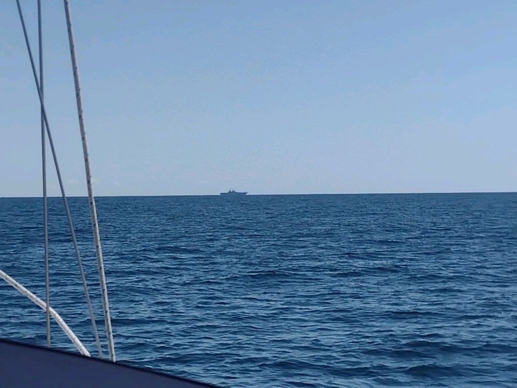 Infinity, Infinity…this is aircraft carrier 1 on 18, over. My head snapped towards the VHF radio in disbelief that someone was actually calling me. Infinity, Infinity…this is aircraft carrier 1 on 18, over. I grabbed the mike and replied… aircraft carrier 1, this is Infinity, over. A very military type voice replied back…Infinity, aircraft carrier 1 is participating in a military exercise and you are required to maintain a 3 mile separation from the vessel at all times. I looked at my chartplotter and saw that there was an AIS marker for a “military vessel” about 5 miles away and moving slowly at 2.5 knots away from me. I replied back that I would maintain the required separation and to have a great day. I adjusted course and it showed that I would pass behind them at about 3.5 miles. Cool, I thought, this won’t be that hard!! Then they changed course more towards me and that dropped the closest point of approach to about 1.8 miles. Lovely, I changed course again to get their required separation and they changed again…😖. Let the games begin…